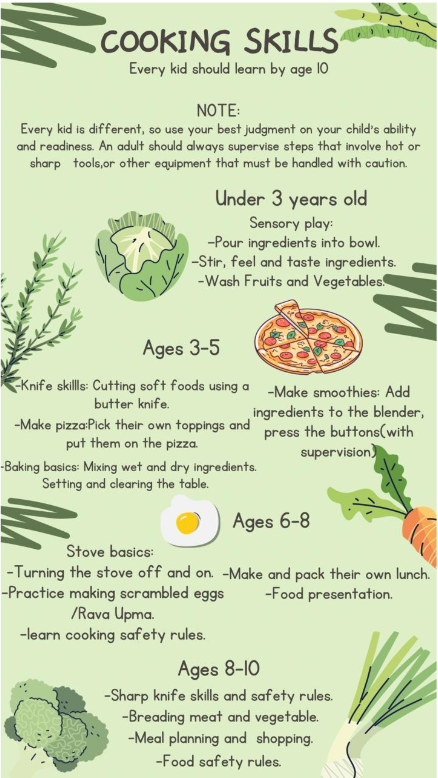 In this age group, you can start to introduce some actual cooking skills. Teach them the basics of using a stove (with your supervision always). Practice turning the stove off and on.